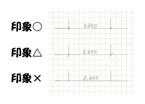 寸法線は、両端を黒丸にするのが一番印象が良くなります。斜線でも減点にはなりませんが、多少印象が悪くなります。(急いで書いた感じが出てしまいます)