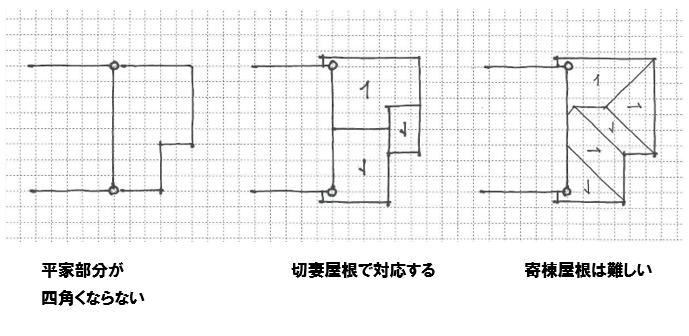 できるだけ切妻屋根で対応して下さい。小さければ片流れでも結構です。