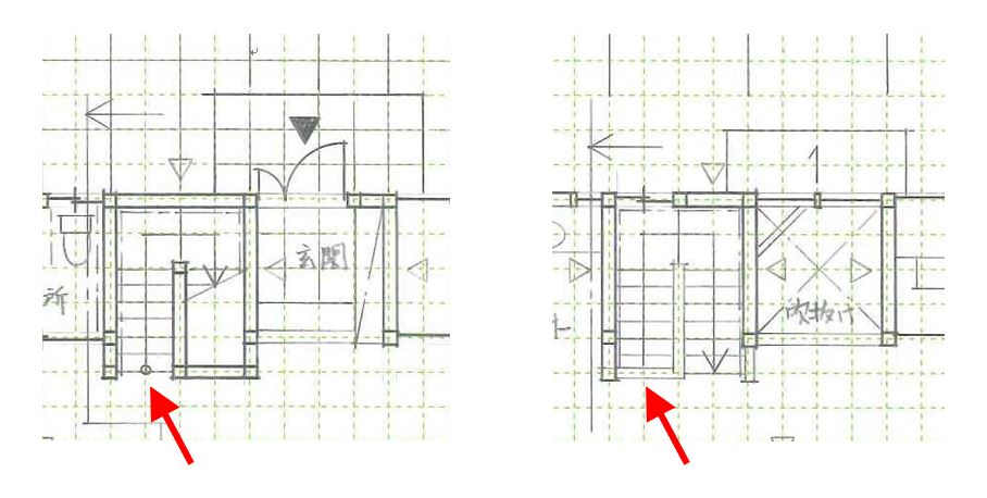 上り始めには丸を記入します(矢印部分)。2階平面図の同じところには丸は不要です。