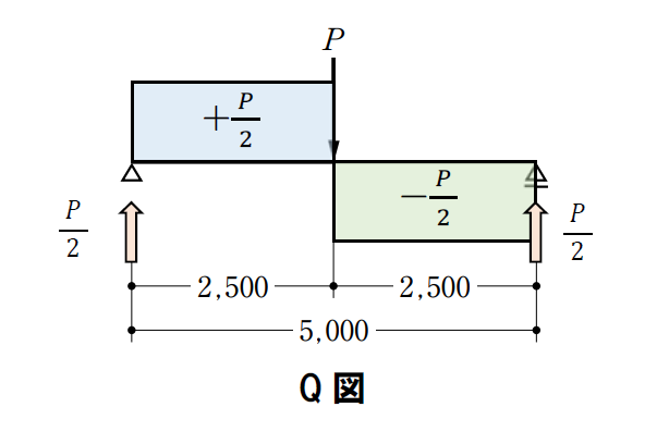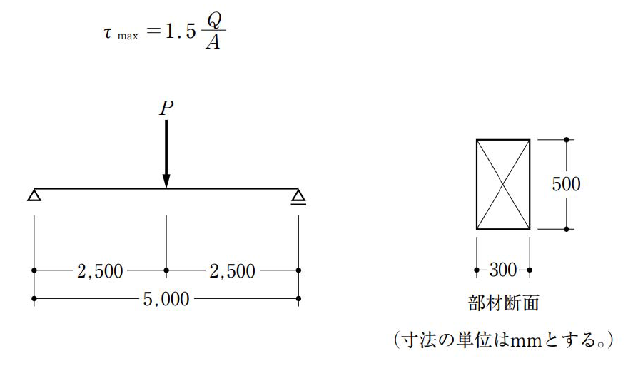 〔No. 2〕 図のような荷重 Pを受ける単純梁に、断面 300 mm×500 mmの部材を用いた場合、その部材に生じるせん断応力度が、許容せん断応力度 1 N/mm2を超えないような最大の荷重 Pとして、正しいものは、次のうちどれか。ただし、せん断力Qが作用する断面積 Aの長方形断面に生じる最大せん断応力度τmaxは、下式によって与えられるものとし、部材の自重は無視するものとする。