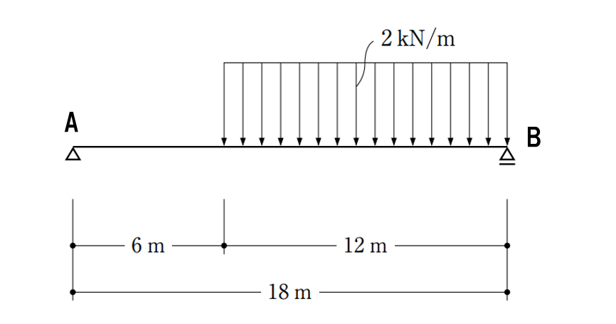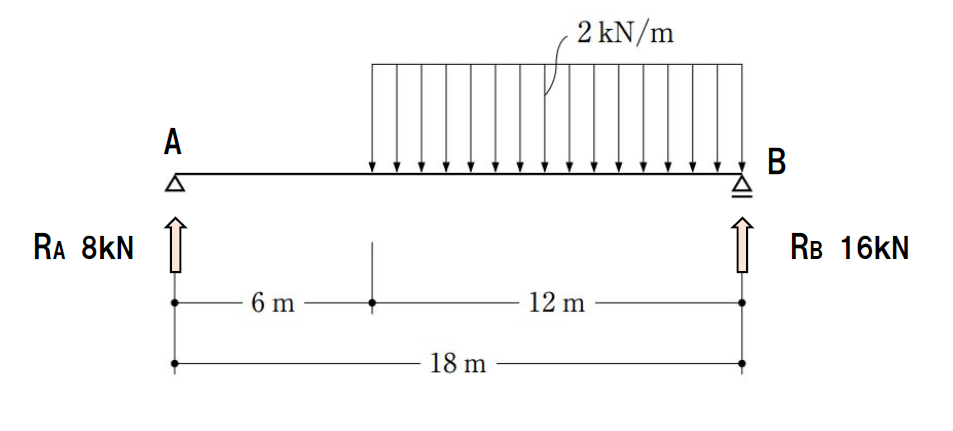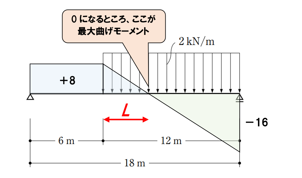 この問題は一見既出かなと思ってしまいますが、曲げモーメントが最大になるところを見つけるのが少し難しいと言えます。この場合、等分布荷重がかかっている範囲の真ん中ではないんですよね。