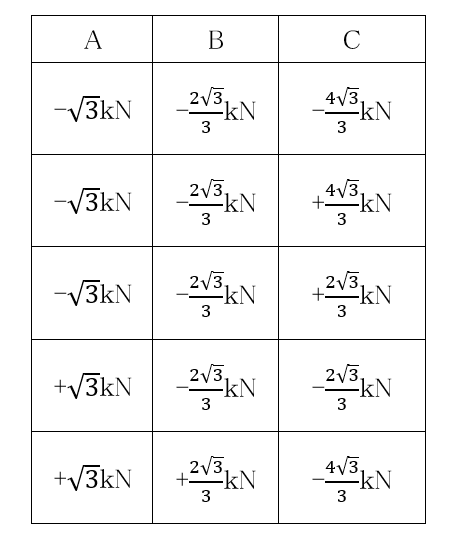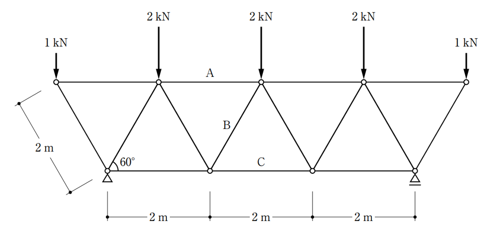 〔No. 5〕 図のような荷重を受ける静定トラスにおいて、部材A、B、Cに生じる軸方向力の組合せとして、正しいものは、次のうちどれか。ただし、軸方向力は、引張力を「+」、圧縮力を「-」とする。なお、節点間距離は全て2mとする。