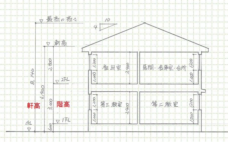 寸法の記入について、階高や軒高を記入しない人、また階高の取り方が間違っている人が多いです。